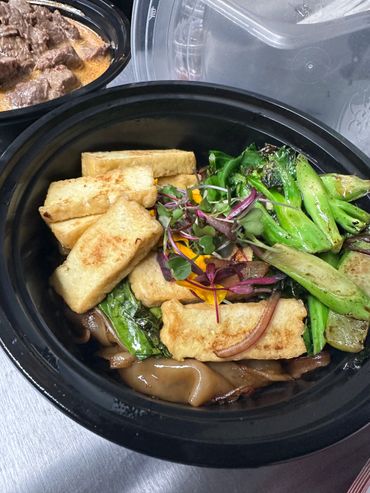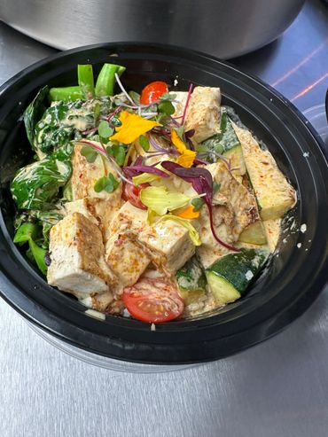 Gluten Free and vegetarian. Zucchini, tomatoes, tofu & Kanaa (Asian Kale) simmered in red curry and coconut milk. Served over rice.